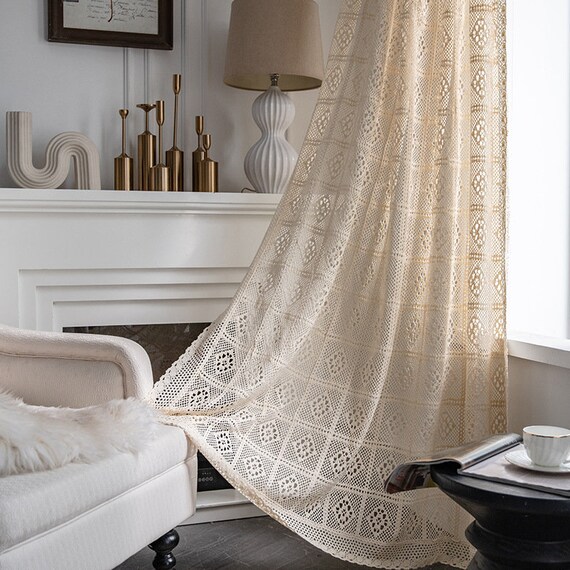 Boho Style Cotton Beige Lace Hollow Flowers Crochet Curtain Etsy